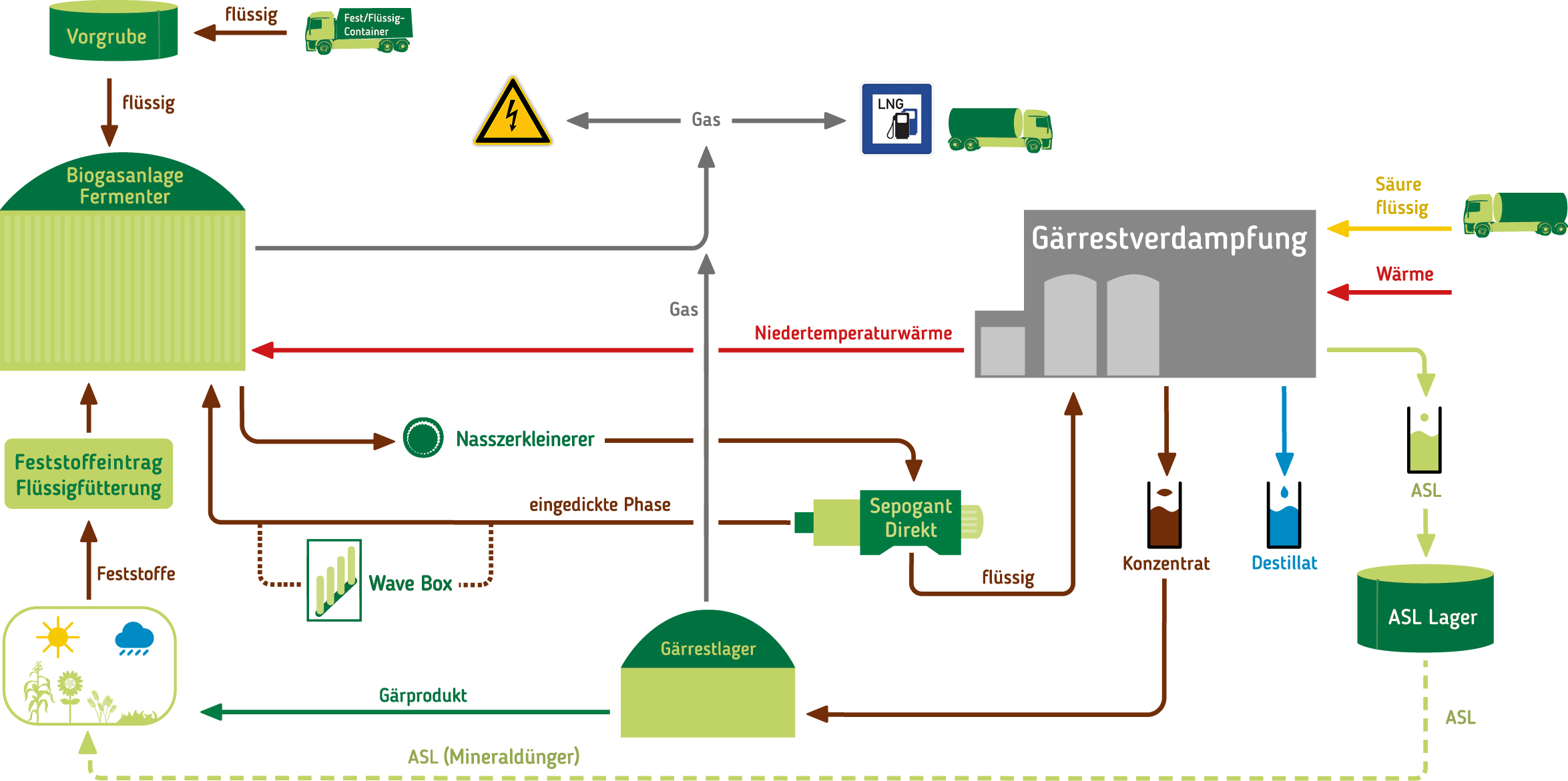 Das in dem gesamten Gärprozess entstandene Biogas wird einer LNG Anlage zugeführt.